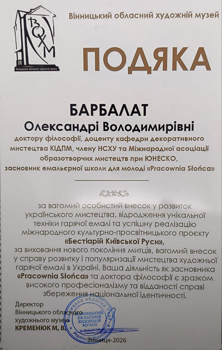 21 січня 2026 року у Вінницькому обласному художньому музеї відбулося урочисте відкриття авторського проєкту доктора філософії, доцента кафедри декоративного мистецтва нашого інституту — Олександри Барбалат.