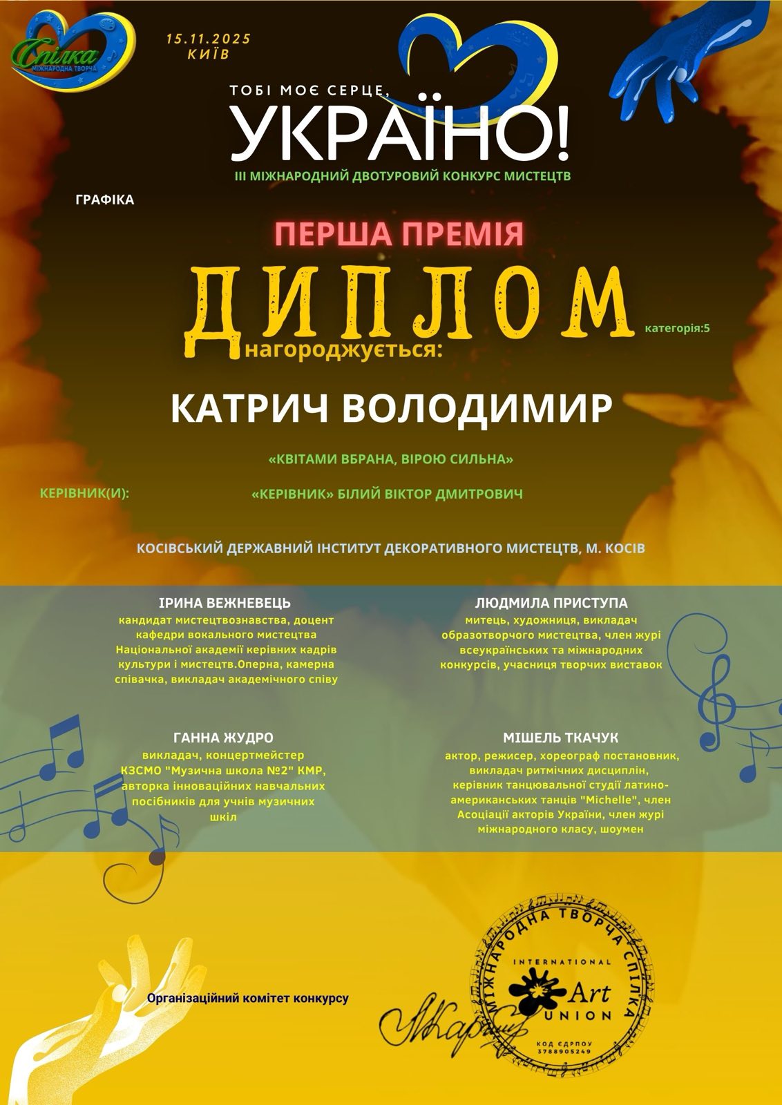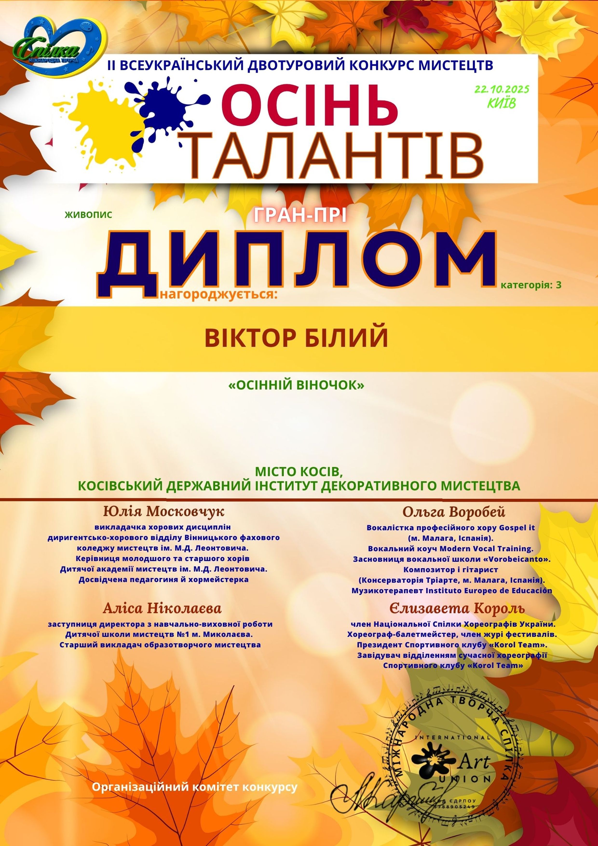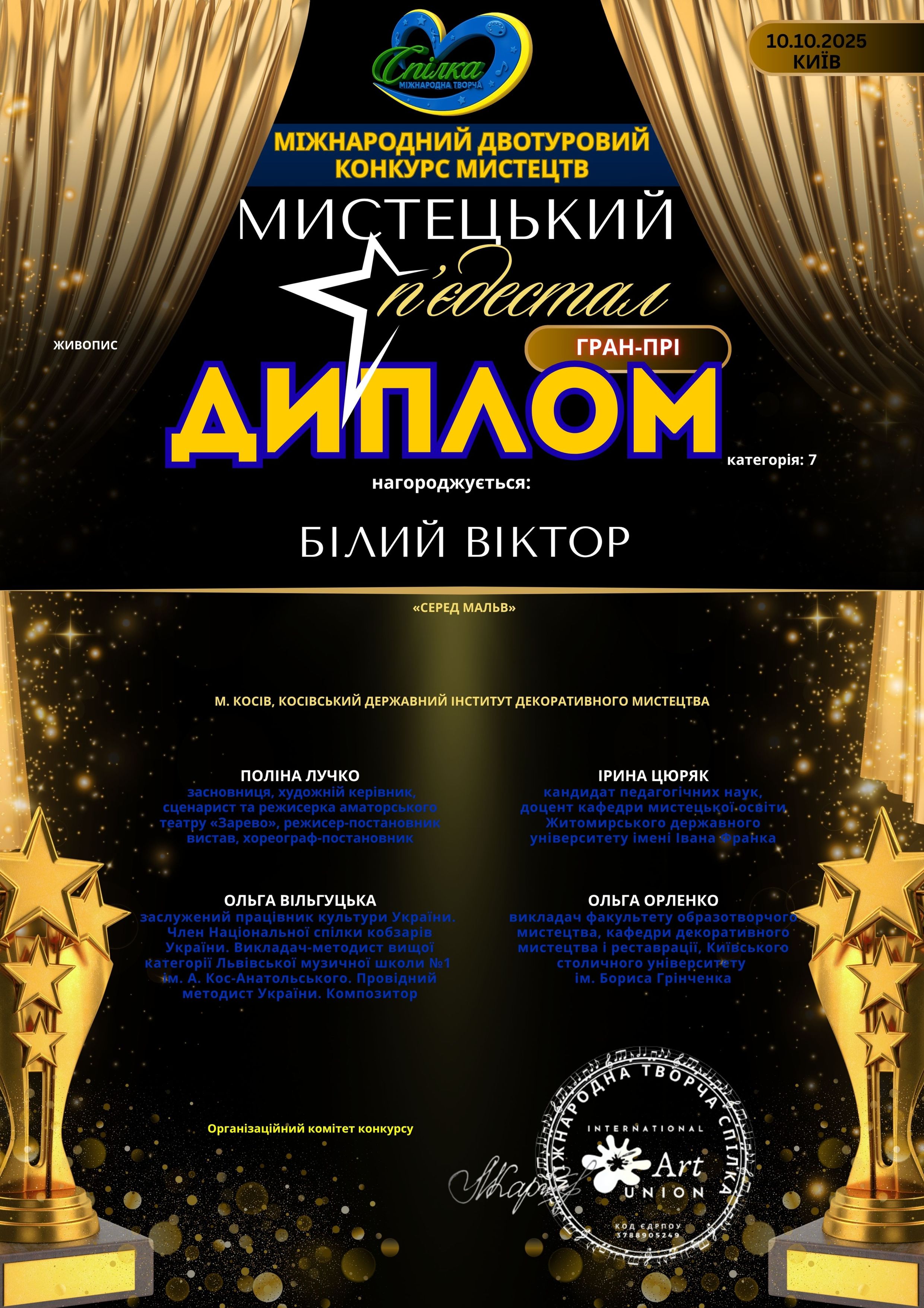 10. Гран-прі за участь у II Міжнародному дистанційному багатожанровому конкурсі “GOLD STAR / ЗОЛОТА ЗІРКА”. Грудень, 2022. Номінація — живопис. Назва роботи : ”Церква Різдва Пресвятої Богородиці (с. Рогиня)” 2021 р., полотно, олія, 50х60 см.