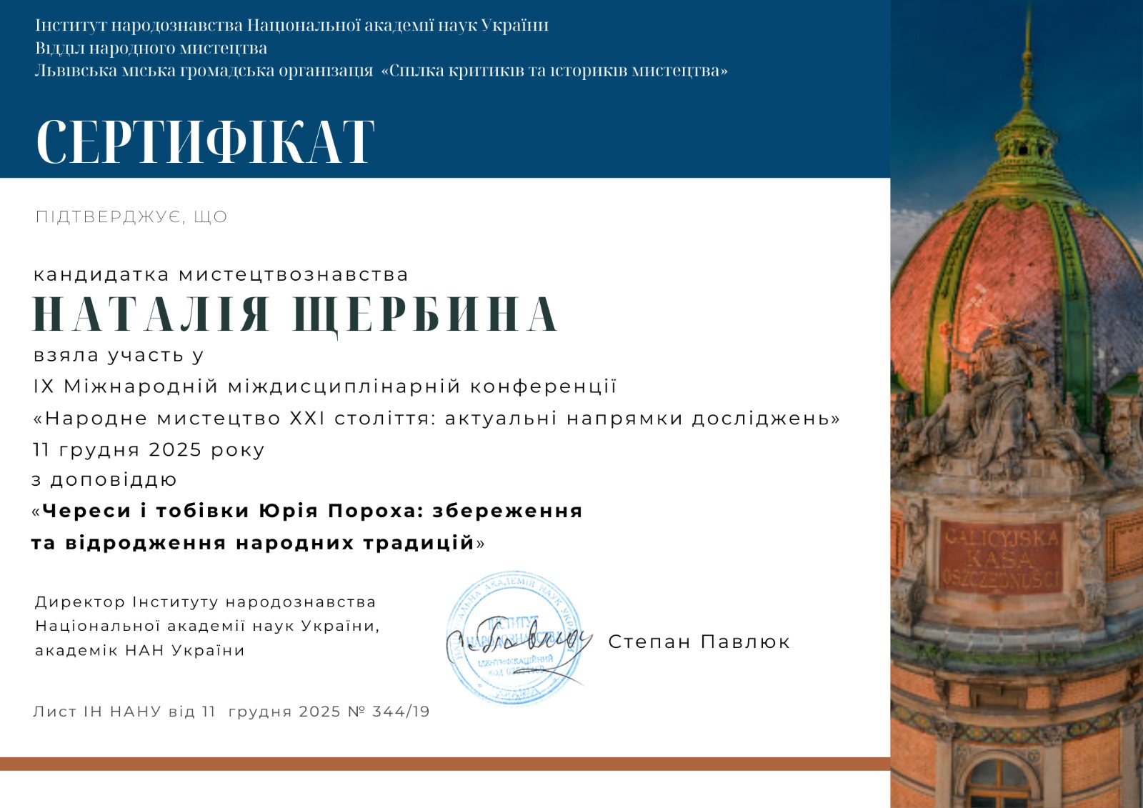 Kishchuk Natalia. The Typological Range of Artistic Leather Goods in Pokuttya and Western Podillya of the Late 19th and Early 20th centuries The European Journal of Humanities and Social Sciences, Premier Publishing s.r.o. Vienna. 1. 2019. Р. 17-22. ISSN 2414-2344 Index Copernicus. http://ppublishing.org/upload/iblock/1e8/EJH-1_2019.pdf